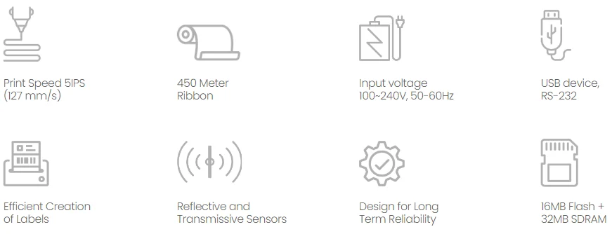 IX4-240 supports a large 8.26 inch outer diameter label roll and up to 450 meter ribbon capacity. Featuring 6 ips print speed, even print with the highest speed, it can still maintain the perfect print quality. The IX4-240 has built-in Ethernet, Dual USB hosts, USB device, RS-232, and it can be expanded with Wi-Fi, GPIO card/Parallel port
